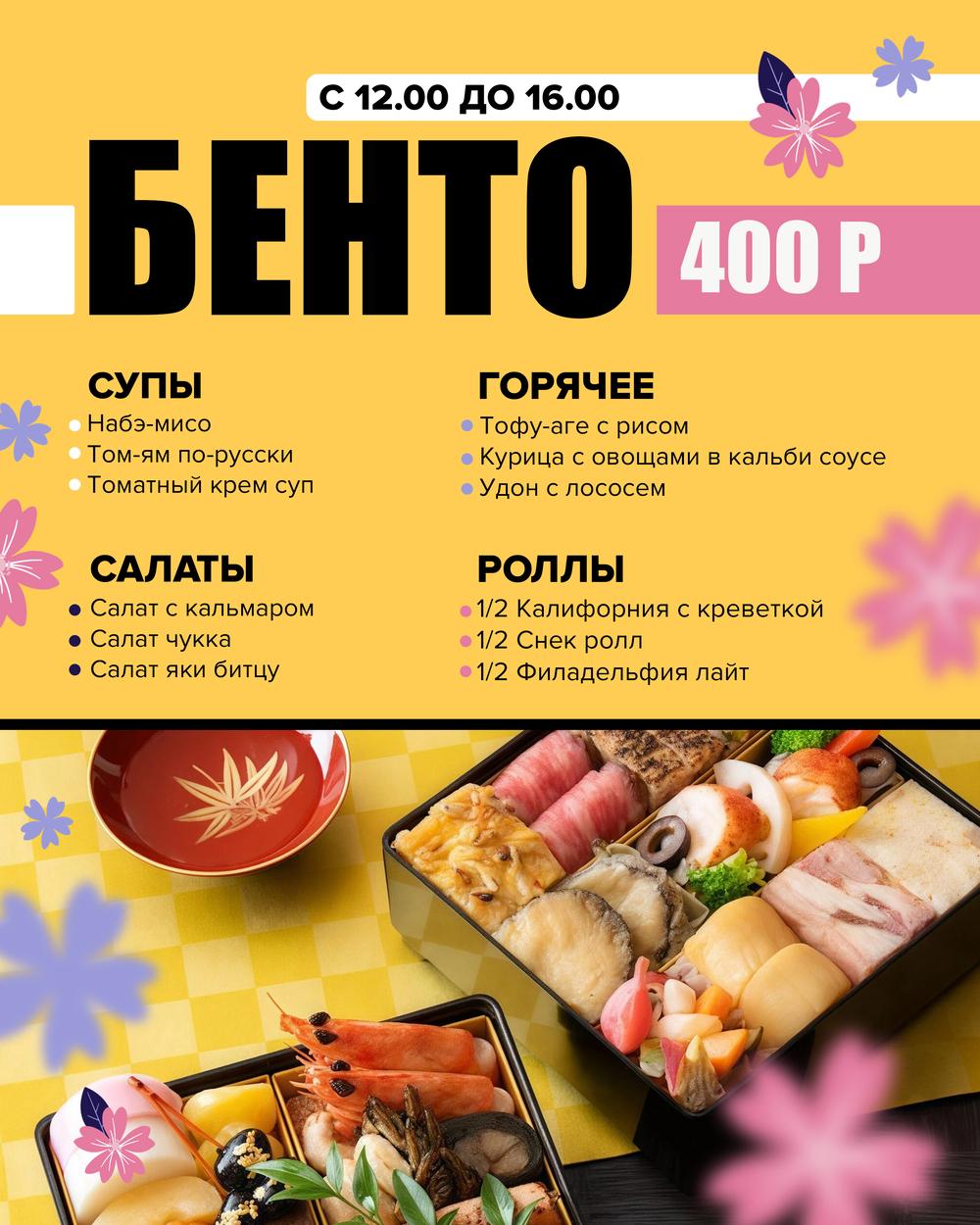 * Бенто действует по будням с 12:00 до 16:00.